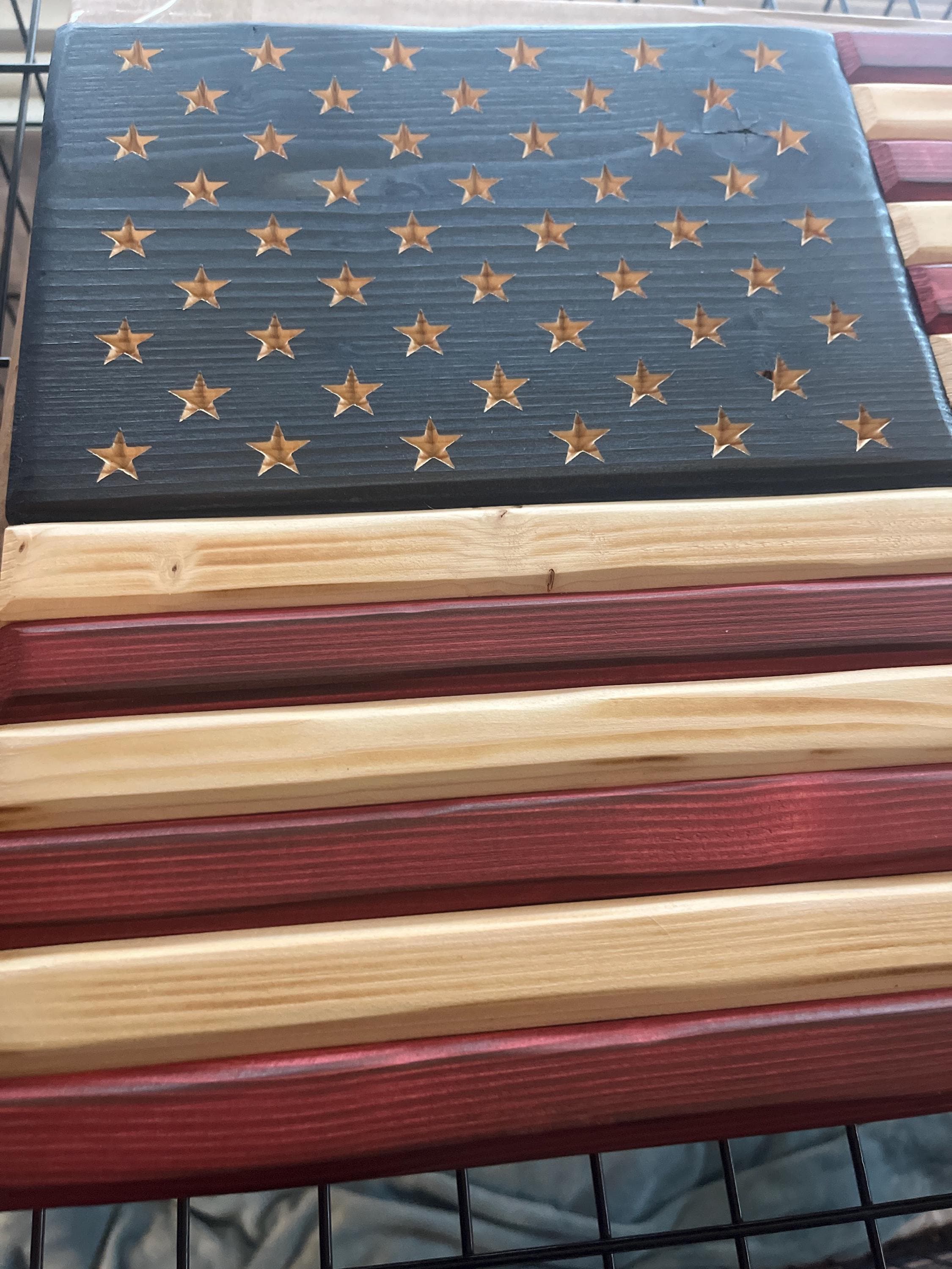 Each American flag we create is a unique and one-of-a-kind piece, handmade to order. We meticulously hand-cut all 14 pieces of the flag, including the 13 stripes and the Union. Our stars are engraved using advanced CNC technology. To achieve a rustic and distressed appearance, we carefully torch the wood, enhancing its natural grain.