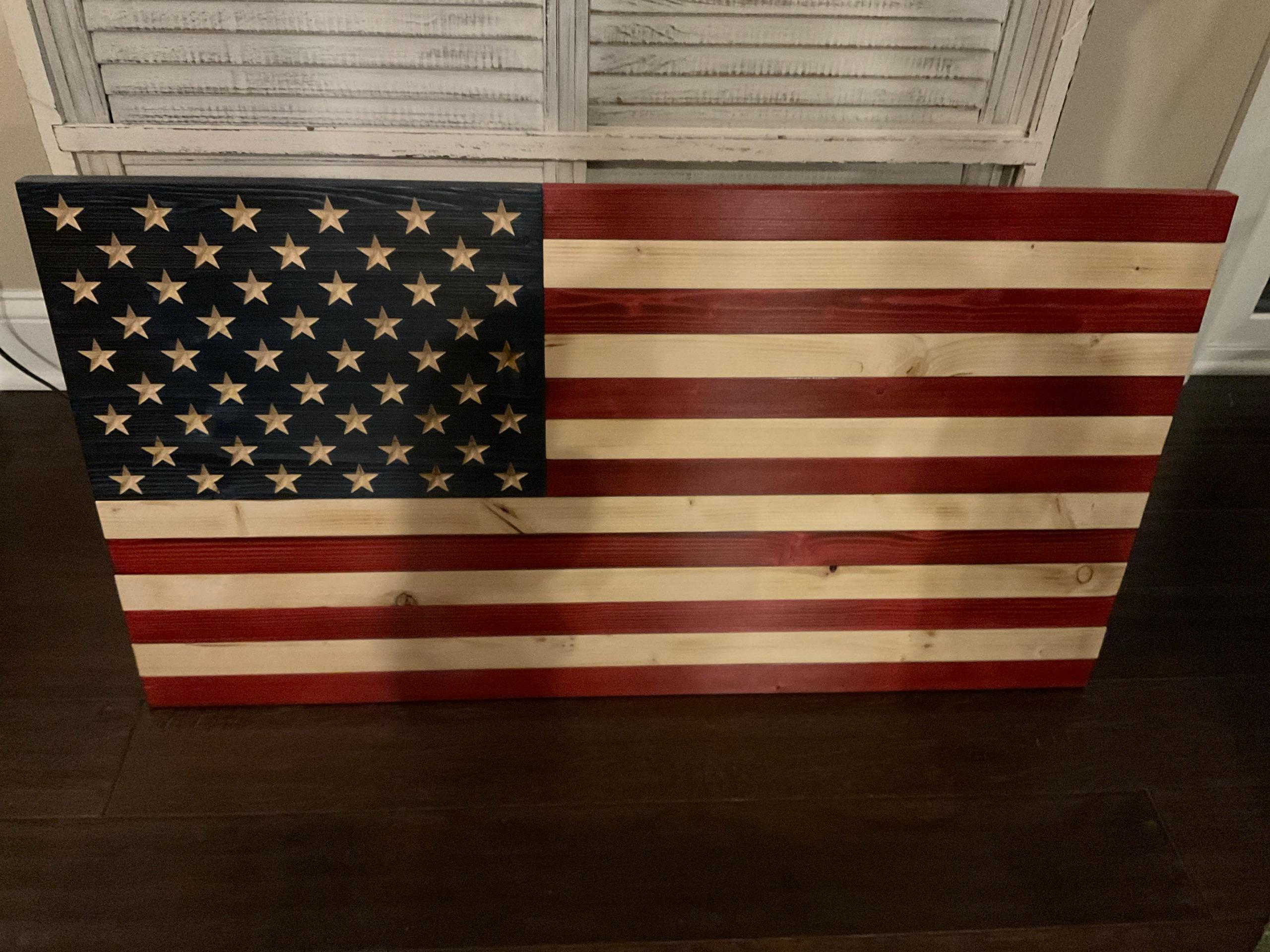 Each American flag we create is a unique and one-of-a-kind piece, handmade to order. We meticulously hand-cut all 14 pieces of the flag, including the 13 stripes and the Union. Our stars are engraved using advanced CNC technology. To achieve a rustic and distressed appearance, we carefully torch the wood, enhancing its natural grain.